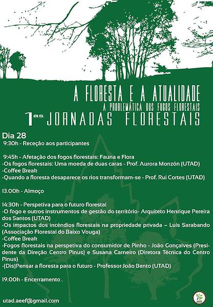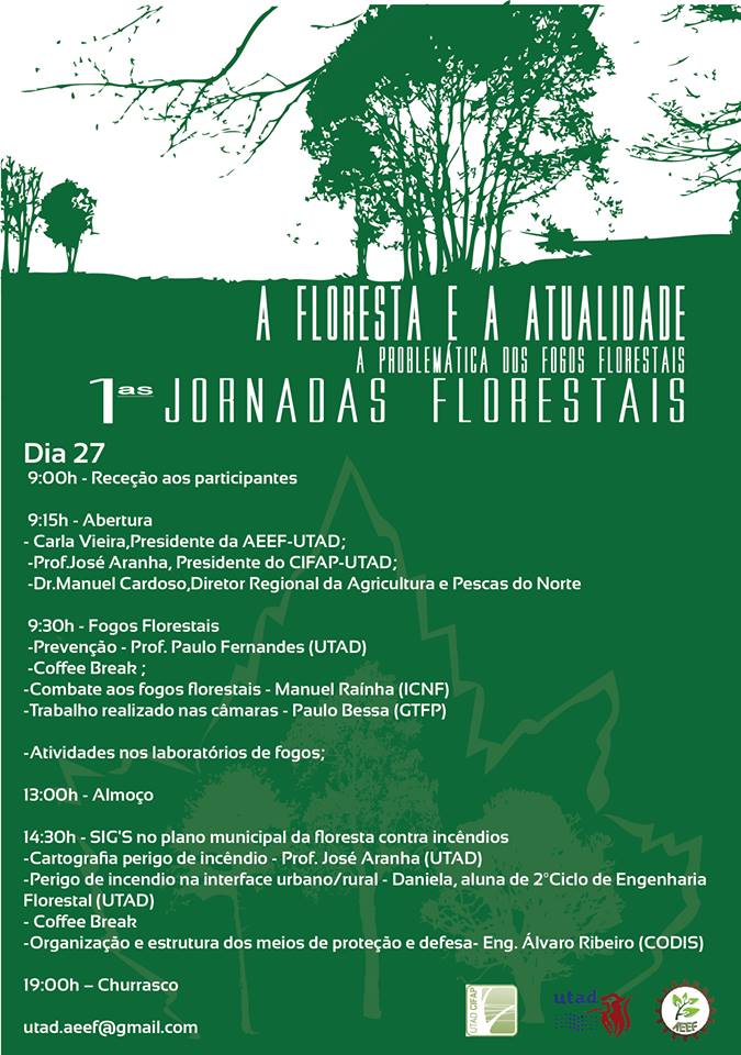A AEEF - Associação de Estudantes de Engenharia Florestal está a organizar as 1ª Jornadas Florestais, que terão lugar a 27 e 28 de fevereiro de 2014 no Auditório do Edifício de Ciências Florestais da Universidade de Trás-os-Montes e Alto Douro, Vila Real.